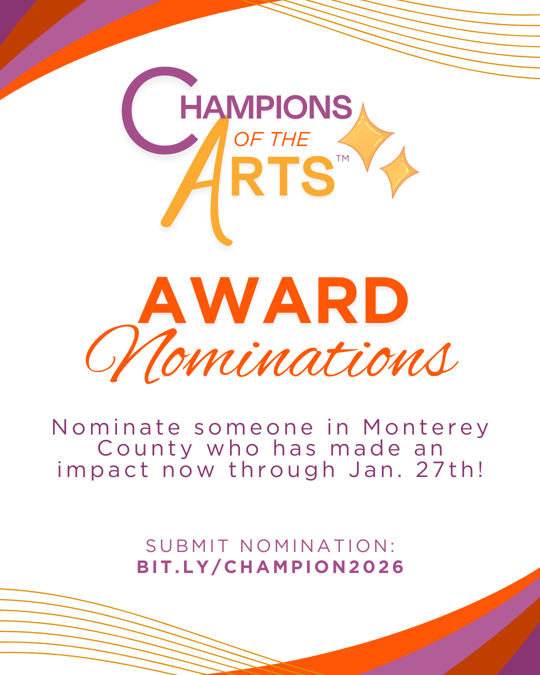 We know there are many amazing individuals, organizations, and businesses making a powerful impact on the arts in Monterey County. Now’s the time to recognize their inspiring work! The Champions of the Arts™ award, presented by Arts4MC, honors those who foster creativity, promote cultural engagement, and strengthen our community through the arts. Nominations close January …