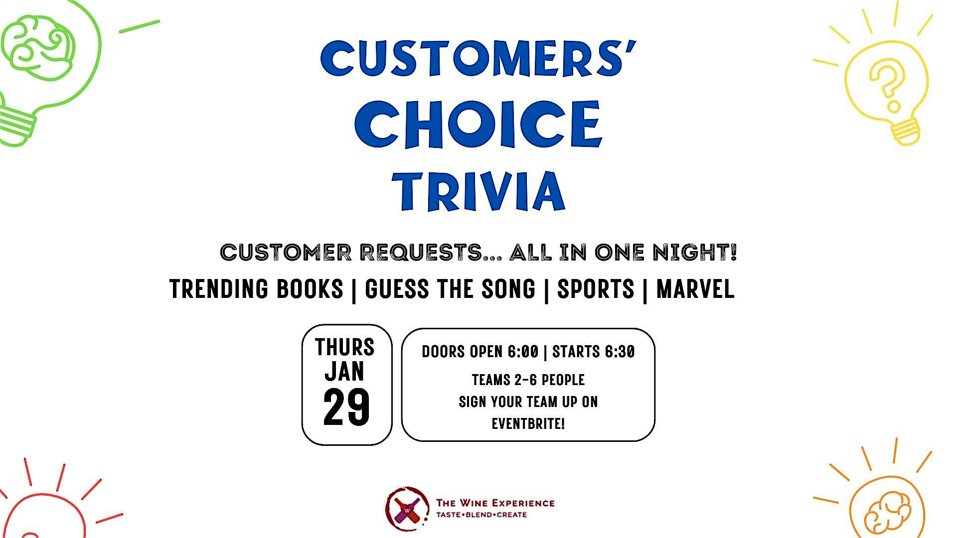 You asked... and we delivered! Join us for trivia night featuring our top-requested themes.Customer's Choice Trivia 1/29Join us at The Wine Experience for a fun night of trivia on January 29 at 6:30 PM! Test your knowledge while enjoying great wine in a relaxed atmosphere.Our last trivia goers voted, and we combined the top requests: …